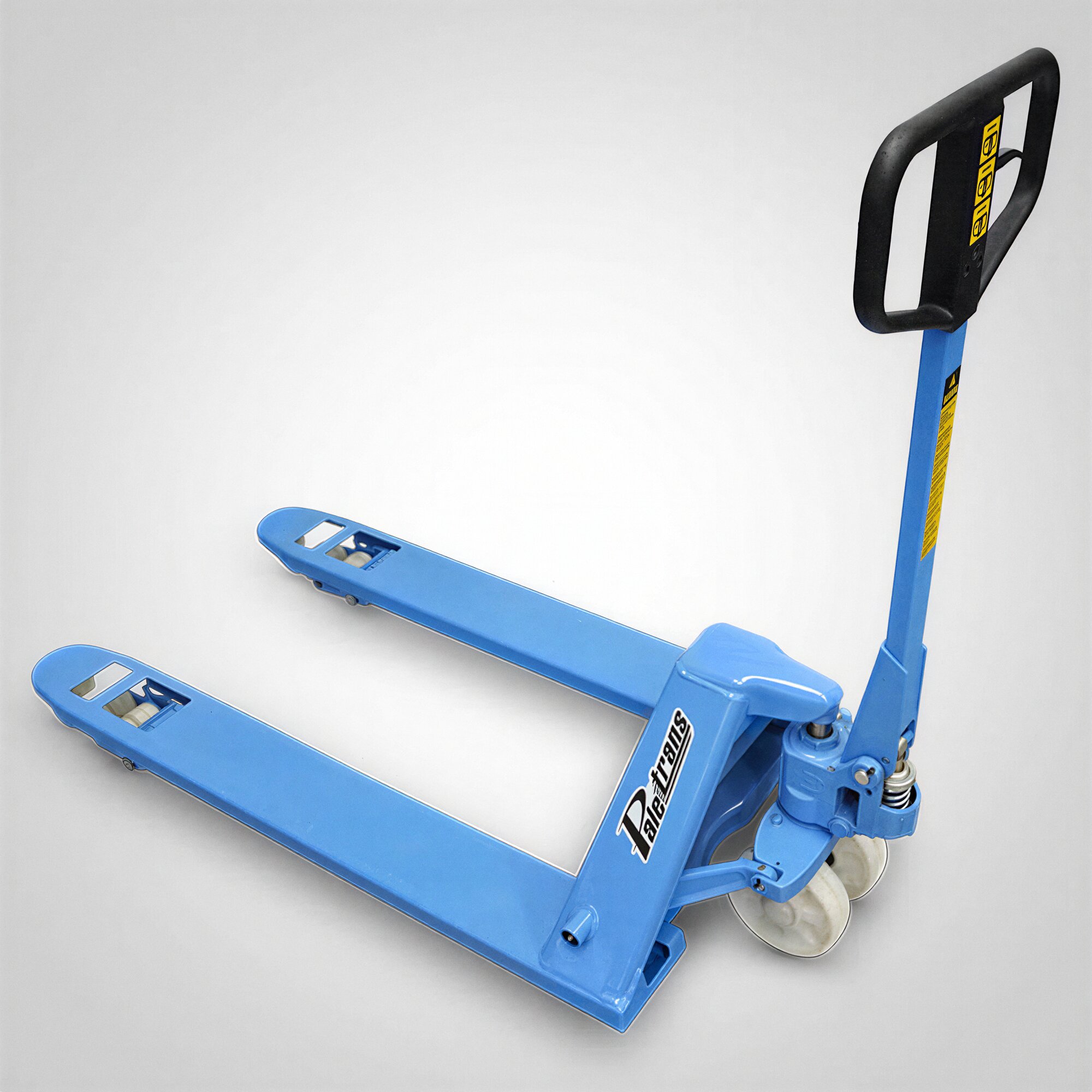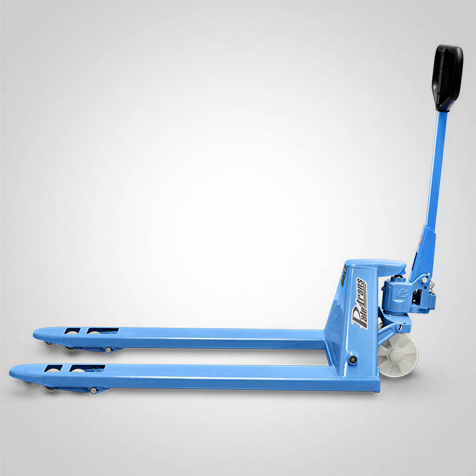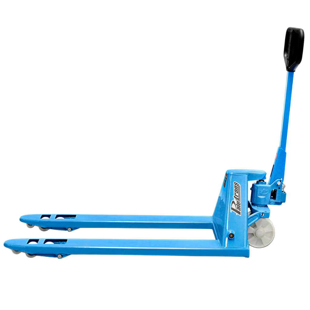 • Garfos longos de até 2,4 metros (largura 680 mm, capacidade de carga de 2.500 kg, rodas tandem em nylon): ideais para o transporte simultâneo de dois paletes, aumentando a produtividade e reduzindo o tempo de movimentação.
